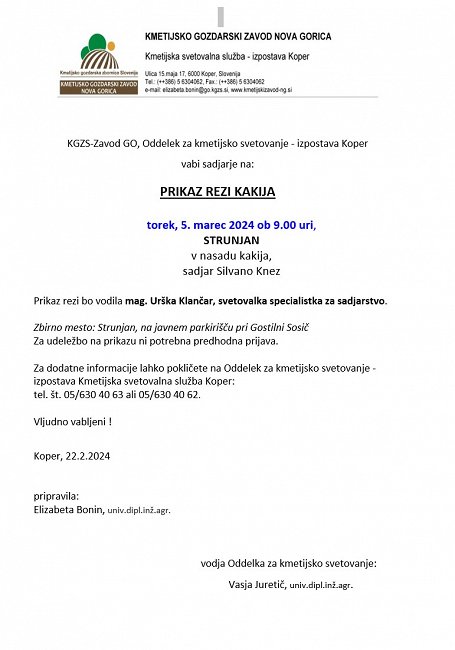 KGZS-Zavod GO, Oddelek za kmetijsko svetovanje - izpostava Koper vabi sadjarje na: PRIKAZ REZI KAKIJA v torek, 5. marec 2024 ob 9.00 uri (STRUNJAN) v nasadu kakija, sadjar Silvano Knez. Prikaz rezi bo vodila mag. Urška Klančar, svetovalka specialistka za sadjarstvo.