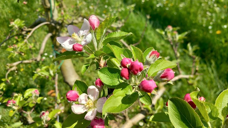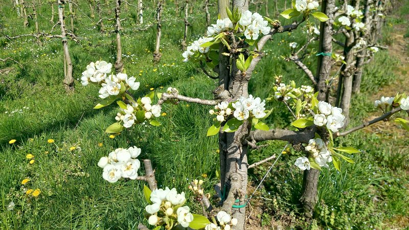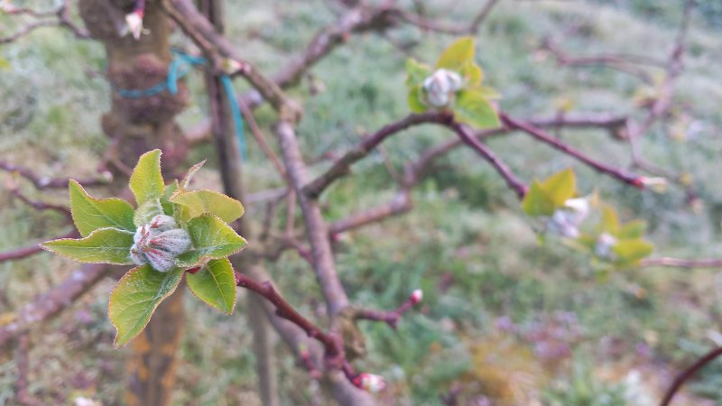Hruške v Vipavski dolini so večinoma v fenološki fazi balona (BBCH 59) oziroma začetka cvetenja (BBCH 60), sorta Junijska lepotica pa na zgodnjih legah že cveti (BBCH 63–65). Jablane dosegajo fazo zelenega do rožnatega popka (BBCH 56–57), pri zgodnjih sortah na izpostavljenih legah pa so že odprti prvi cvetovi. V Brkinih in na Tolminskem so jablane še v fazi mišjega ušesa (BBCH 54) oziroma fazi vidnih cvetnih popkov (BBCH 55), medtem ko na toplejših legah omenjenih območij že dosegajo fazo zelenega popka (BBCH 57).