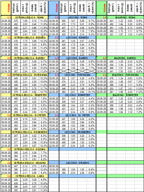 Preglednica: Ocena pridelka, trdota in masa plodov, indeks zrelosti ter vsebnost olja v plodovih oljk sorte ISTRSKA BELICA, LECCINO, MAURINO v času dozorevanja.