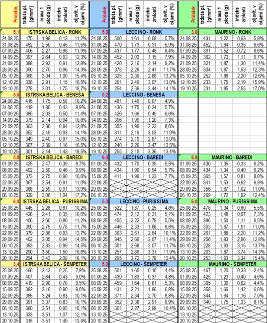 Indeks zrelosti pri sorti Istrska Belica je ocenjen (pozno barvanje) in ni prikazan v grafih. Za temne sorte (Leccino) je primeren čas obiranja, ko je indeks zrelosti med 3,5 in 4,0.