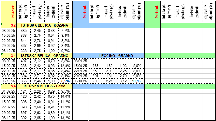 Indeks zrelosti pri sorti Istrska Belica je ocenjen (pozno barvanje) in ni prikazan v grafih. Za temne sorte (Leccino) je primeren čas obiranja, ko je indeks zrelosti med 3,5 in 4,0.