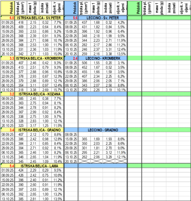 | Pred začetkom vzorčenja smo ocenili rodnost v opazovanih nasadih, prvo vzorčenje pa smo opravili 24. in 25. avgusta. Sorto 'Istrska Belica' in 'Leccino' smo vzorčili na lokacijah Strunjan – Ronk, Ankaran – Beneša, Baredi, Sveti Peter, Purissima, Šempeter, Kromberk in Gradno, sorto 'Istrska Belica' dodatno še v na Bivju – Lama in v Kozani. Sorto 'Maurino' smo vzorčili na lokacijah Strunjan – Ronk, Baredi, Purissima in Šempeter. V Baredih so obrane že vse tri sorte, v Šempetru sorti 'Maurino' in 'Leccino', v Kromberku obe spremljani sorti, na Lami sorta 'Istrska Belica', v Gradnem pa sorta 'Leccino'. 'Istrska Belica': Trdota plodov te sorte je večinoma nižja kot v letu 2024 (6 – nižja, 1 – enaka). Na štirih lokacijah je enaka, na dveh nižja, na eni pa višja kot v dolgoletnem povprečju (od 278 do 342 g/mm2). Oljevitost v laboratorijski oljarni je na treh lokacijah višja, na dveh enaka in dveh nižja kot v dolgoletnem povprečju. Na štirih lokacijah je višja, na eni enaka in na dveh pa nižja kot v prejšnjem letu (od 13,4 do 18,7 %). 'Leccino': Plodovi se intenzivneje barvajo, indeks zrelosti je na dveh lokacijah enak, na eni višji, na eni pa nižji kot v povprečnem letu. Na vseh lokacijah je višji kot v letu 2024 (od 3,4 do 3,5). Trdota plodov je na vseh štirih lokacijah enaka kot v povprečju, na treh lokacijah je nižja, na eni pa enaka kot v letu 2024 (od 254 do 295 g/mm2). Oljevitost v laboratorijski oljarni je na vseh lokacijah višja kot v lanskem letu in v dolgoletnem povprečju (13,4 do 14,1 %). 'Maurino': Indeks zrelosti (obarvanost) na preostalih lokacijah je 2,6 in 3,3. Obarvanost plodov je višja kot v letu 2024. Trdota plodov je bila pri zadnjem vzorčenju nekoliko višja. Oljevitost je višja kot v letu 2024 v istem obdobju (15,4 in 17,0 %). |