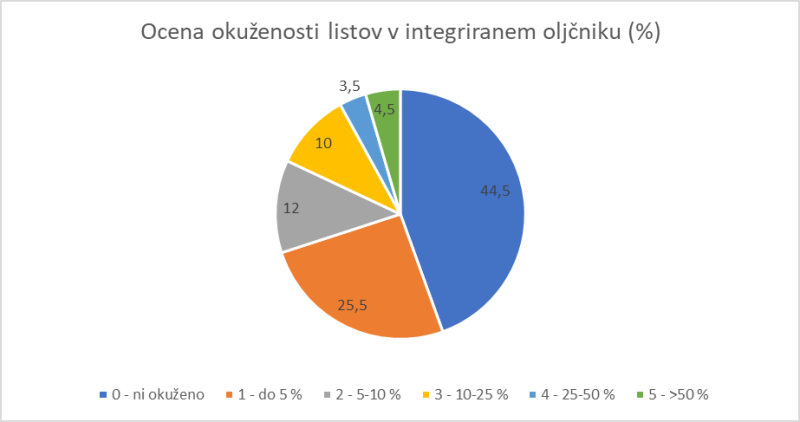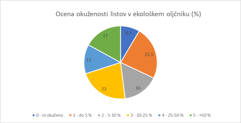 V tekočem tednu smo v posameznih oljčnikih na območju Slovenske Istre opravili prvo oceno okuženosti listov Istrske belice. Delež okužb se od nasada do nasada razlikuje in je odvisen od različnih dejavnikov kot so lega oljčnika, rez, gnojenje in načina varstva oljk. Podrobneje so prikazani rezultati vzorčenja dveh oljčnikov, kjer se v prvem izvaja integrirano varstvo, v drugem pa poteka ekološka pridelava oljk. V vsakem oljčniku smo naključno izbrali po dvesto listov katere smo kasneje namakali v 5% raztopini natrijevega hidroksida. Na podlagi deleža okuženosti listov smo slednje razporedili v šest razredov, in sicer 0-ni okuženo; 1- do 5% okužb; 2- 5-10% okužb; 3- 10-25% okužb; 4 - 25-50% okužb in 5 - ˃50% okužb.