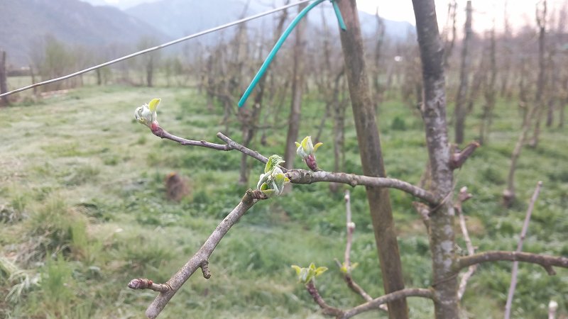 Hruške v Vipavski dolini so večinoma v fenološki fazi balona (BBCH 59) oziroma začetka cvetenja (BBCH 60), sorta Junijska lepotica pa na zgodnjih legah že cveti (BBCH 63–65). Jablane dosegajo fazo zelenega do rožnatega popka (BBCH 56–57), pri zgodnjih sortah na izpostavljenih legah pa so že odprti prvi cvetovi. V Brkinih in na Tolminskem so jablane še v fazi mišjega ušesa (BBCH 54) oziroma fazi vidnih cvetnih popkov (BBCH 55), medtem ko na toplejših legah omenjenih območij že dosegajo fazo zelenega popka (BBCH 57).