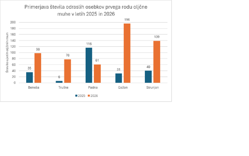 V aprilu se zaključi let prvega rodu oljčne muhe. Na podlagi rezultatov spremljanja škodljivca v prvih treh mesecih letošnjega leta ugotavljamo, da je vrsta dobro prezimila. V posameznih oljčnikih celo opažamo večje populacije prvega rodu škodljivca v primerjavi s sezono 2025. Vrh naleta prvega rodu oljčne muhe je bil zabeležen v drugi dekadi marca.