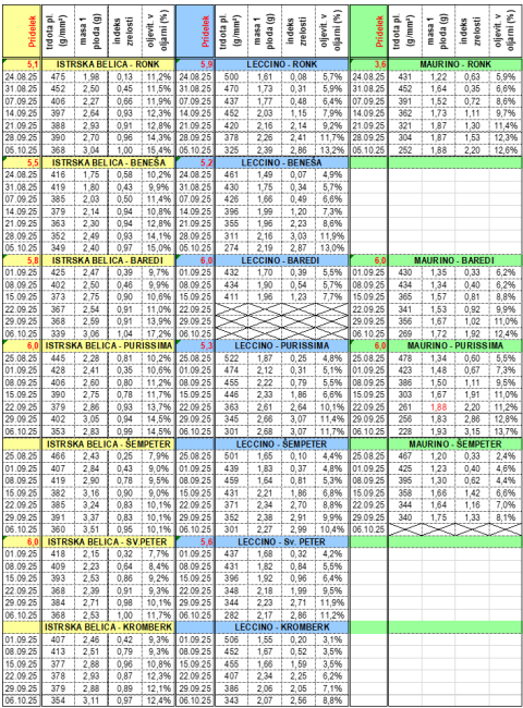 Pred začetkom vzorčenja smo ocenili rodnost v opazovanih nasadih, prvo vzorčenje pa smo opravili 24. in 25. avgusta. Sorto 'Istrska Belica' in 'Leccino' smo vzorčili na lokacijah Strunjan – Ronk, Ankaran – Beneša, Baredi, Sveti Peter, Purissima, Šempeter, Kromberk in Gradno, sorto 'Istrska Belica' dodatno še v na Bivju – Lama in v Kozani. Sorto 'Maurino' smo vzorčili na lokacijah Strunjan – Ronk, Baredi, Purissima in Šempeter. V Šempetru je sorta 'Maurino' obrana, v Baredih pa sorta 'Leccino'. 'Istrska Belica': Trdota plodov te sorte je nižja kot v letu 2024 in večinoma nižja kot v dolgoletnem povprečju (338 do 392 g/mm2). Oljevitost v laboratorijski oljarni je na dveh lokacijah višja, na dveh enaka in šestih nižja kot v dolgoletnem povprečju. Na treh lokacijah je višja, na treh enaka in na štirih nižja kot v prejšnjem letu (9,7 do 17,2 %). 'Leccino': Plodovi se intenzivneje barvajo, indeks zrelosti je večinoma enak kot v povprečnem letu in letu 2024 (od 2,6 do 3,1). Trdota plodov je na eni lokaciji višja, na petih enaka, na dveh pa nižja kot v povprečju in večinoma nižja kot v letu 2024 (274 do 343 g/mm2). Oljevitost v laboratorijski oljarni je načeloma višja kot v lanskem letu in višja kot v dolgoletnem povprečju. 'Maurino': Plodovi se intenzivneje barvajo, indeks zrelosti je od 1,9 do 3,2. Obarvanost plodov je enaka ali višja kot v letu 2024. Trdota plodov je bila pri zadnjem vzorčenju na vseh lokacijah enaka kot v istem obdobju v letu 2024 (228 do 269 g/mm2). Oljevitost je višja kot v letu 2024 v istem obdobju. |